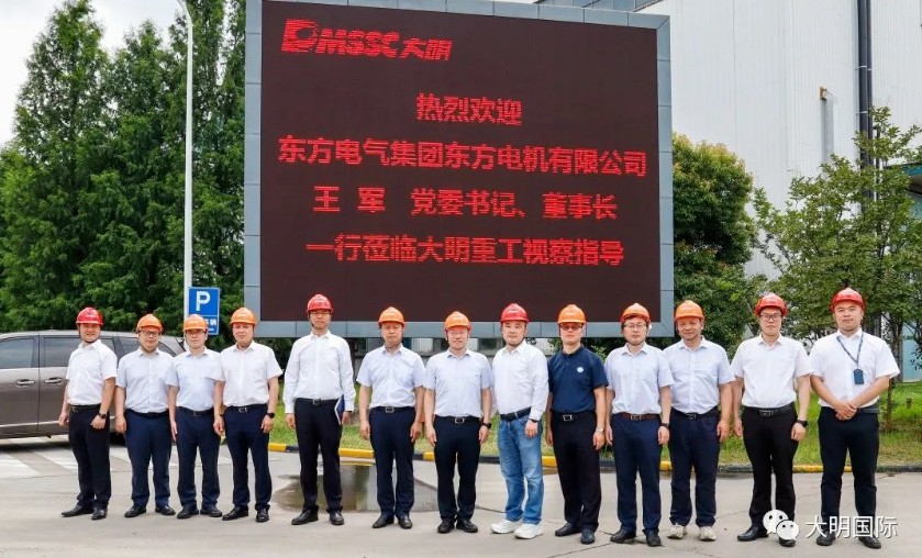 周克明主席代表大明集团热烈欢迎王军董事长一行的到访。双方围绕行业发展趋势、焊接自动化、企业管理协同、数字化工厂建设等主题进行了深入交流,并对未来如何把握火电、抽蓄大发展机会进行了探讨。 在相关领导的见证下,双方签订了第二代百万外机座合作合同和抽水蓄能平江洛宁磁轭加工合同。王军董事长和周克明主席共同为东方电机&大明重工协同制造基地揭牌。 东方电机胡雷副主任、大明重型装备朱利民总经理签约合影 东方电机潘辉主任、大明重工陈宁总裁签约合影 东方电机赵强总会计师为揭牌仪式致辞 王军董事长与周克明主席代表双方为协同制造基地揭牌