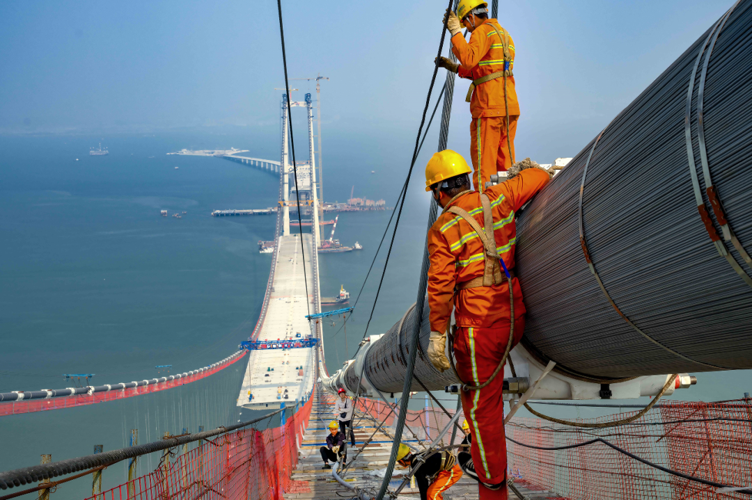 “为了保证往来船只顺利通航,深中大桥桥面高达91米,相当于30层楼高,是世界上最高通航净空的跨海桥梁。加之处在珠江口开阔水域,强台风频发,国外著名桥梁公司认为‘无法满足抗风安全要求’。”深中通道管理中心常务副主任范传斌说。“哪里能服输!”范传斌回忆道,在深中通道管理中心牵头组织下,多个单位联合攻关,历时3年多,研发了新型组合气动控制技术,攻克了台风频发区超大跨整体钢箱梁悬索桥灾变控制技术,一举打破了国外权威的论断。除此之外,正交异性钢桥面板疲劳及海中悬索桥主缆防腐等问题,也是世界性难题。悬索桥,指的是以通过索塔悬挂并锚固于两岸或桥两端的缆索作为上部结构主要承重构件的桥梁。“缆索是悬索桥受力的关键构件之一,也是悬索桥的‘生命线’。”范传斌介绍,深中大桥跨度大,且长期处于高温、高盐、高湿的海洋环境,金属腐蚀疲劳问题突出,全寿命周期不能更换,对缆索强度、耐腐蚀性要求极高。为此,深中大桥所使用的主缆钢丝十分特别:6毫米直径、2060兆帕的锌铝多元合金镀层钢丝,其耐盐雾腐蚀性能至少是现有热镀锌钢丝的1倍、锌铝镀层钢丝的2倍。“无论是强度还是耐腐蚀性能,都达到了世界领先水平。这也是我国自主研发的2060兆帕钢丝‘中国芯’在世界上首次大规模应用于悬索桥主缆建造。”范传斌介绍,深中大桥上下游共设两根主缆,单根主缆长约3000米、重约17000吨,由199束索股组成,每束索股又由127丝高强钢丝组成,单丝承载力可以吊起三辆小汽车。一桥飞架,跨越伶仃。五年时间里,建设团队克服了全海上作业、建设条件复杂、频发强台风等诸多不利条件,最终让深中大桥巍然矗立于海天之间。如今,自东向西,粤港澳大湾区世界级跨海集群工程深中通道若游龙潜海,又似长龙卧波,再次一举打破珠江两岸时空局限,为大湾区这片发展热土再添跨海通道。