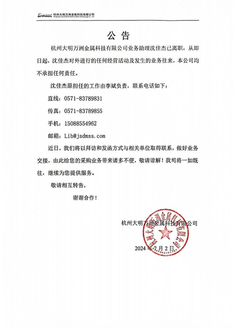 关于沈佳杰的离职公告